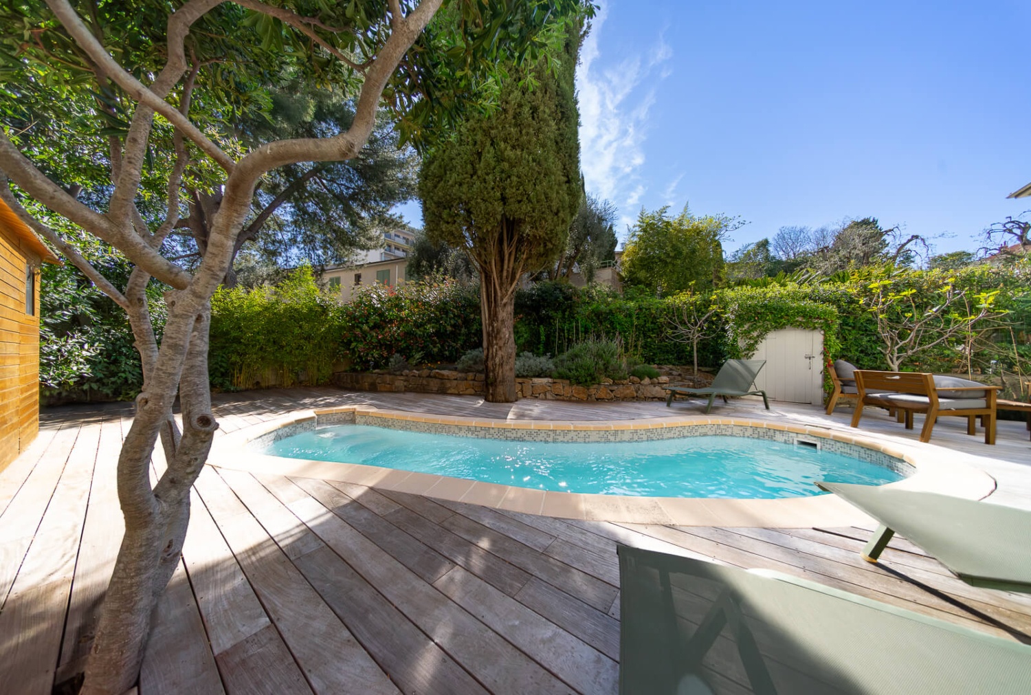 Édifiée sur un terrain de 380 m² aux essences méditerranéennes, elle séduit par ses extérieurs soignés : piscine chauffée privée, terrasses ombragées et espaces de vie extérieurs propices à la détente.